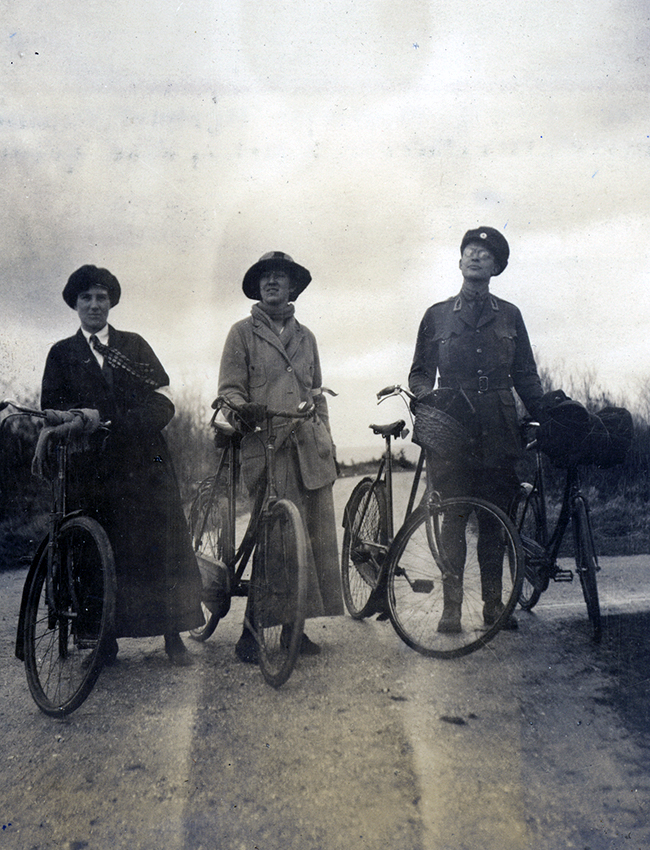 Item is a photograph of Katharine McLennan, Edith Parkman, and G. Jackson posing beside their bicycles on a day trip to Quilleboeuf. Katharine and her nursing friends would often use their time off-duty to explore the French countryside.