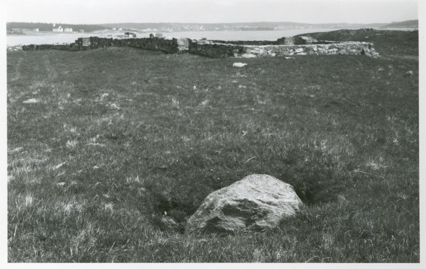 Item is a photograph of a boulder that was found at the Fortress Louisbourg site prior to its reconstruction. This boulder is one of note because its location was indicated on a 1726 map that detailed the De Mezy House.