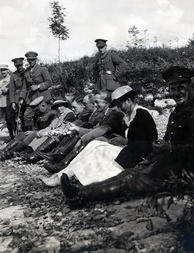 Item is a photograph of members of the English Forestry Corps. enjoying a lunch with WWI Red Cross volunteer Edith Parkman. The photo shows a moment of relaxation during wartime.