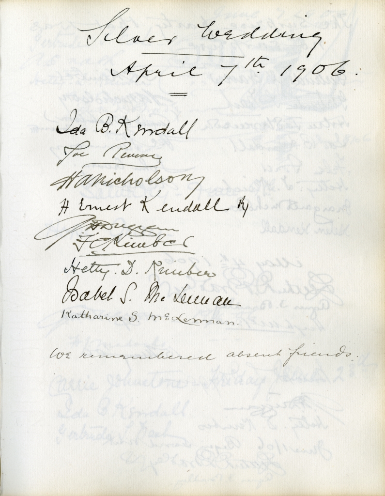 Other notable pages in the guestbook include Isabel's wedding (page 106), the tragic death of Louise McLennan in 1912 (page 109), Margaret's wedding to future Lieutenant-Governor, Dr. Henry Ernest Kendall (page 113), the deaths of both son Hugh and J.S.'s brother Bart in battle during World War I (page 126). J.S. McLennan's death is noted in an elegant tribute written by Katharine on page 162.