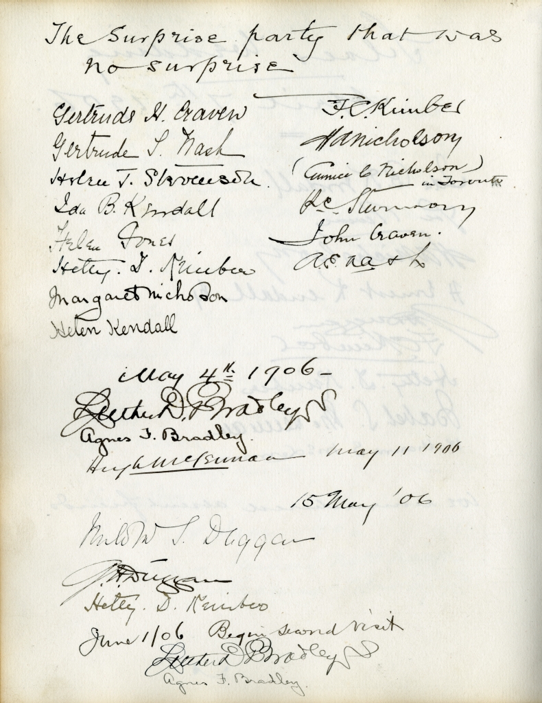 Item is the guestbook that was used at the Petersfield Estate, and later by Katharine at events on her home on Whitney Avenue, Sydney. In fact, Petersfield is most famous and historically interesting because of the guests who stayed there. Besides frequent local visitors like Hetty Kimber and her brother Fred, Shirley Davidson, the Burchells, the Sutherlands, the Grosvenors and visiting family members, the estate boasted visitors of international renown.