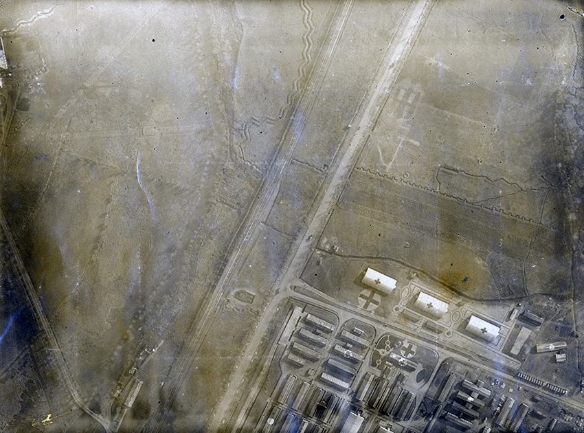 Item is an aerial photograph of the H.O.E. 18, S.P. 118 in Vasseny, France, where Katharine McLennan served as a Red Cross nursing volunteer from October 1917 until the Spring of 1918, when she returned to Canada for a short visit. Unlike the two hospitals in which Katharine had previously volunteered, the H.O.E. 18 offered none of the charms of the French countryside. The photograph shows not only the hospital, but also trenches, barbed wire entanglements and the Soissons-Rheims Road.