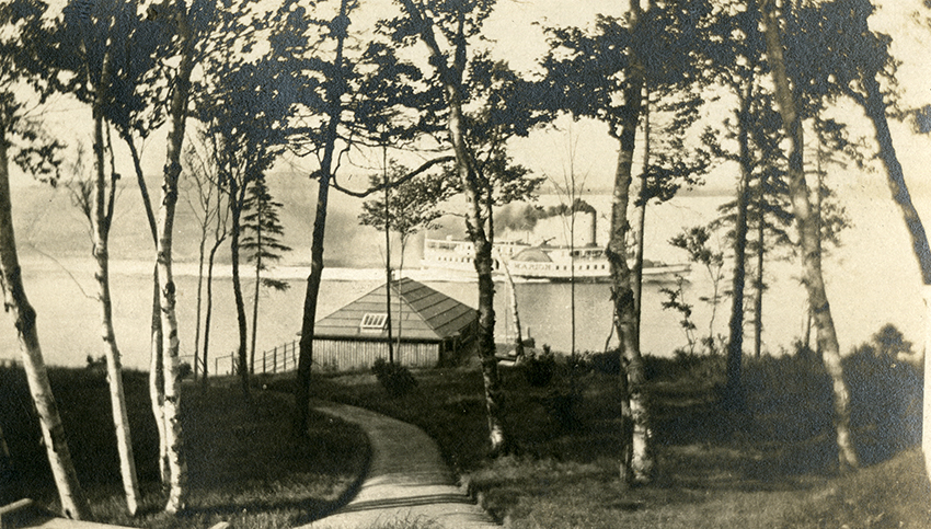 Item is a photograph of steamer The Marion passing by the Boat House at Petersfield.