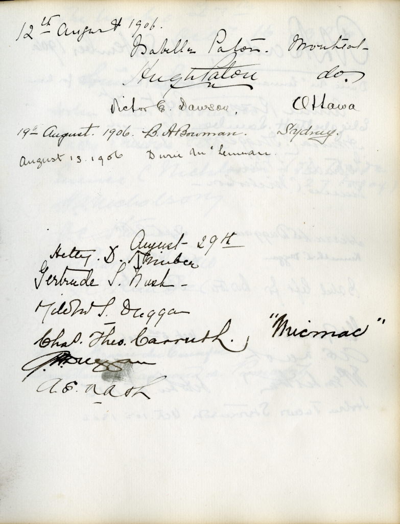 Other notable pages in the guestbook include Isabel's wedding (page 106), the tragic death of Louise McLennan in 1912 (page 109), Margaret's wedding to future Lieutenant-Governor, Dr. Henry Ernest Kendall (page 113), the deaths of both son Hugh and J.S.'s brother Bart in battle during World War I (page 126). J.S. McLennan's death is noted in an elegant tribute written by Katharine on page 162.
