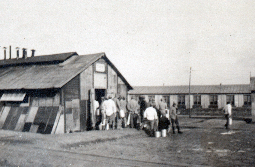 Item is a photograph of infirmiers waiting for soup outside the kitchen at the H.O.E. 18, S.P. 118 in Vasseny, France.