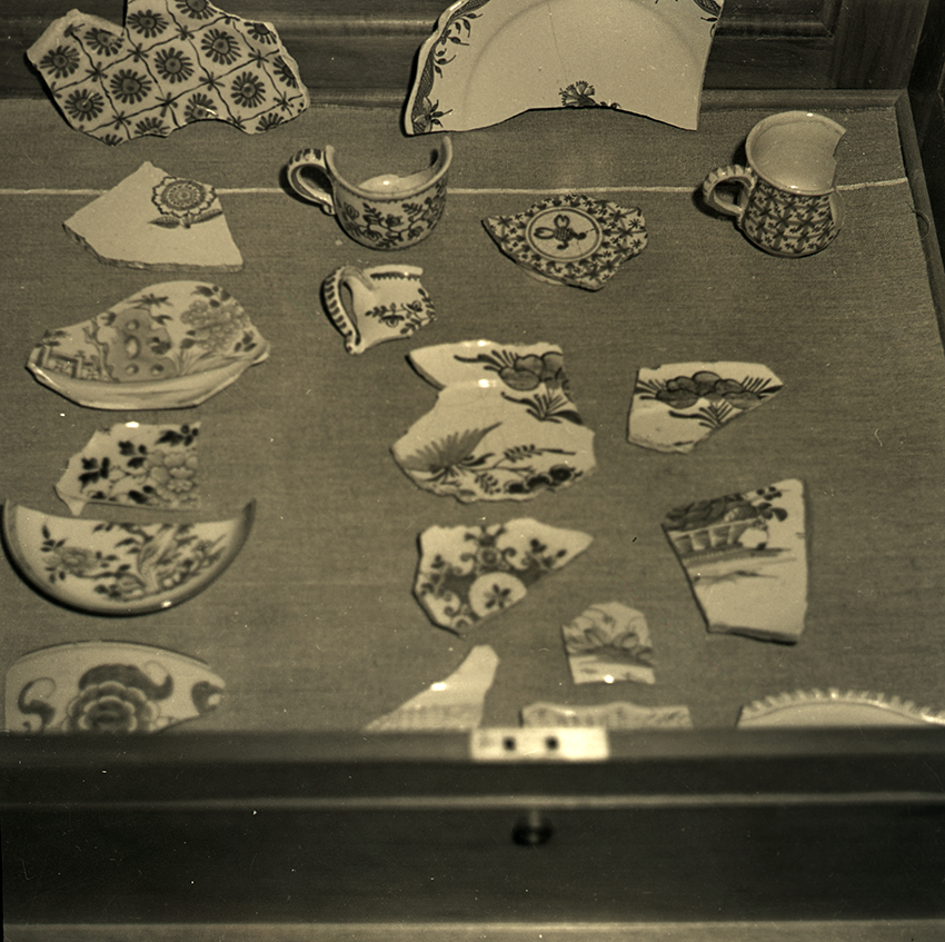 Item is a photograph of a display case containing porcelain fragments at the Louisbourg Museum.