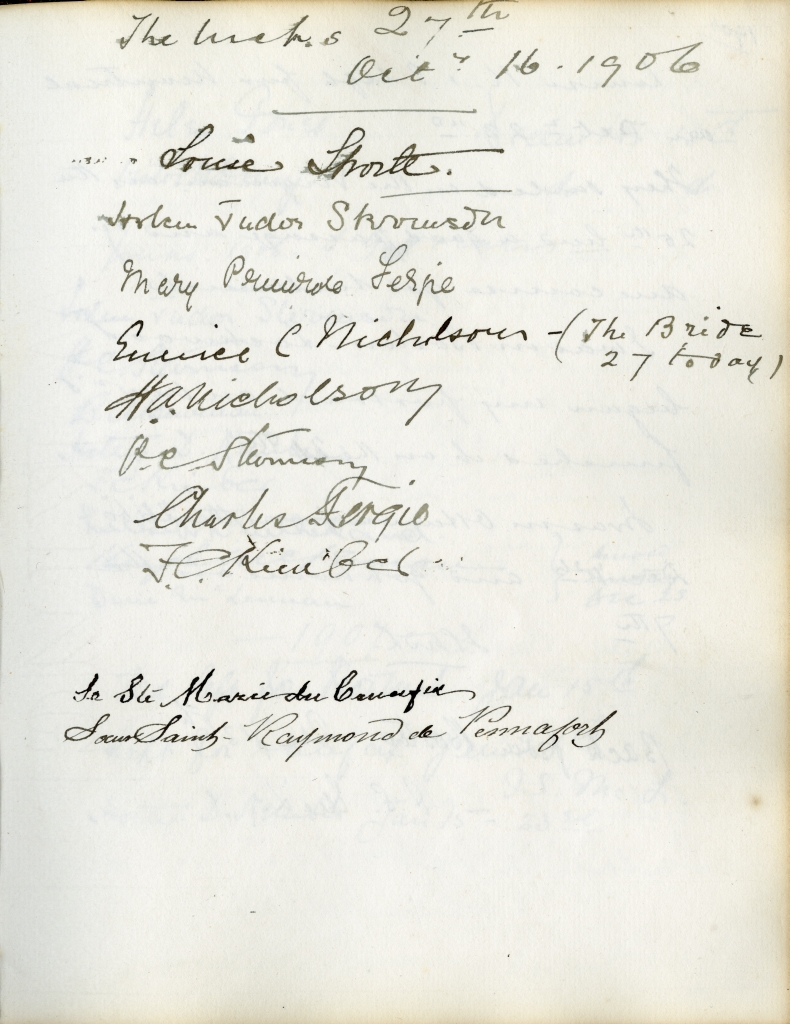 Other notable pages in the guestbook include Isabel's wedding (page 106), the tragic death of Louise McLennan in 1912 (page 109), Margaret's wedding to future Lieutenant-Governor, Dr. Henry Ernest Kendall (page 113), the deaths of both son Hugh and J.S.'s brother Bart in battle during World War I (page 126). J.S. McLennan's death is noted in an elegant tribute written by Katharine on page 162.