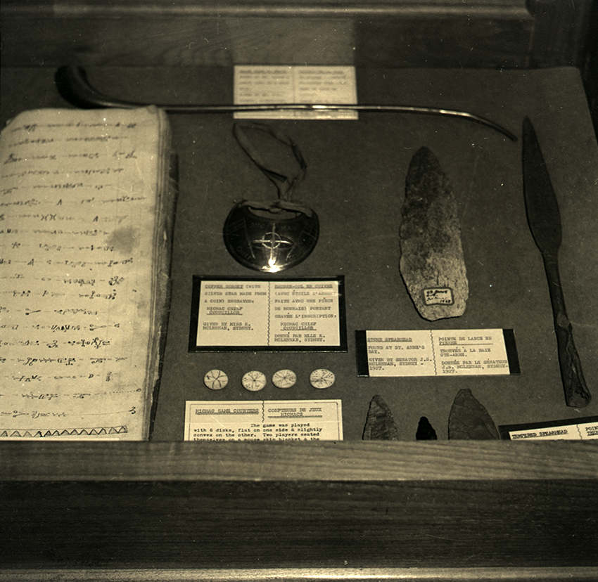 Item is a photograph of a display case at the Louisbourg Museum which features several Mi'kmaw artifacts, including a stone spearhead found at St. Ann's Bay, game counters, and a copper gorget.