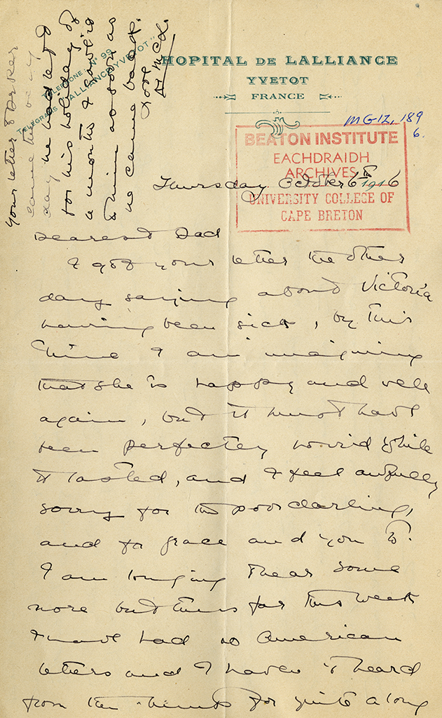 Item is a letter from Katharine McLennan to her father, J.S. McLennan, dated 6 October 1916. In the letter, Katharine tells her father about some of the patients that she has been tending to at the Hôpital de l'Alliance in Yvetot, France, and offers a description of some of her coworkers and the hospital. In addition, Katharine indicates that they are awaiting the imminent arrival of Edith Parkman - a woman who would spend a great deal of time with Katharine bother during and after the War.