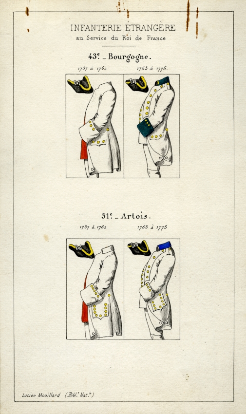 Item is a drawing of French Foreign Infantry uniforms, dating from 1737-1775.The uniforms shown are those from Bourgogne (43rd infantry) and Artois (31st infantry). Some description is available on the drawing in French.