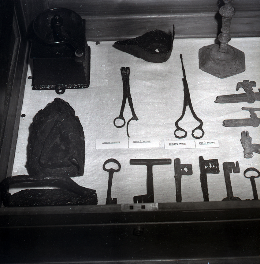 Item is a photograph of a display in the Louisbourg Museum featuring several metal artifacts, including keys, curling tongs, an iron, and artery forceps.