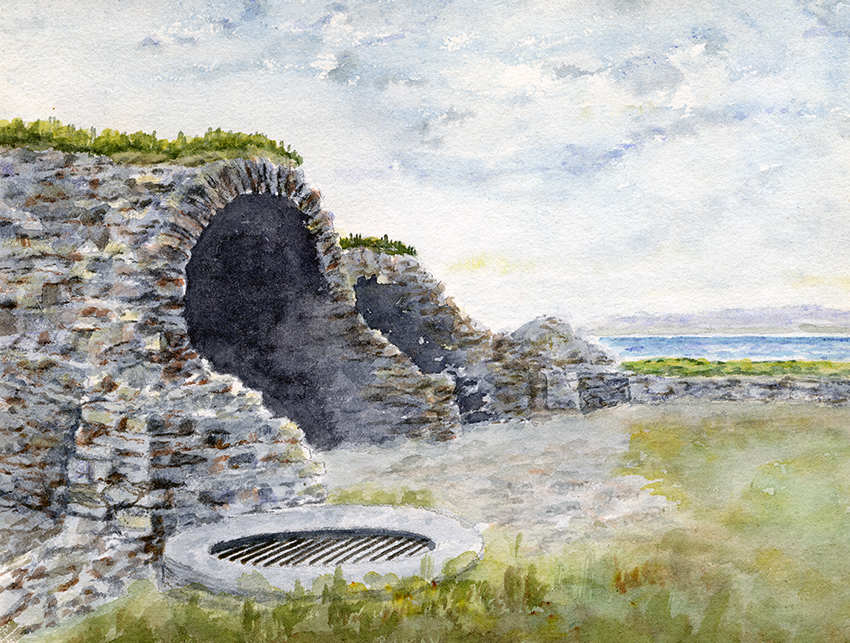 Item is a watercolor painting of the remains of the King's Bastion casements at the Fortress of Louisbourg prior to its reconstruction. Given to Katharine McLennan from Anne Crawley, this watercolor by an unknown artist was presented with a printed note that says that the freestone was used to construct the Fortress of Louisbourg.