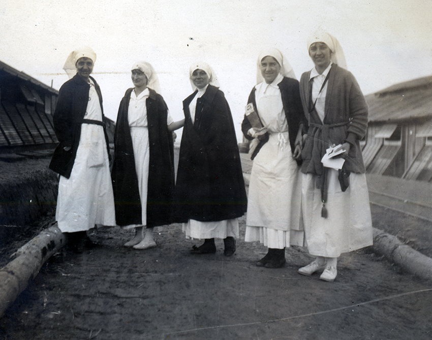 Item is a photograph of nurses Mme. Champion, Mlle. de Bournat, Mlle. Tillet, Katharine McLennan and Edith Parkman posing at the H.O.E. 18, S.P. 118 in Vasseny, France.