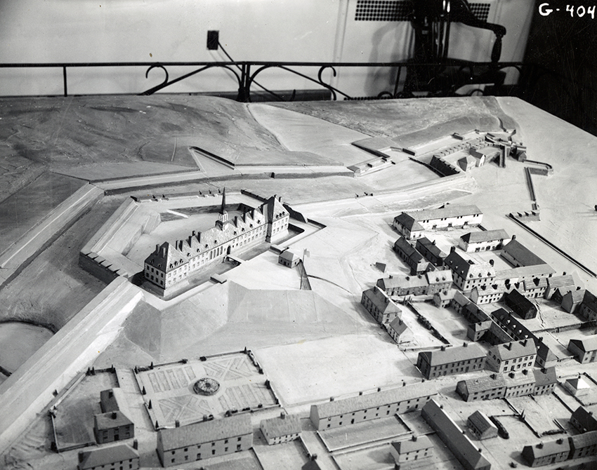 Item is a photograph of the model of the Fortress of Louisbourg in the Museum, showing the King's Bastion.
