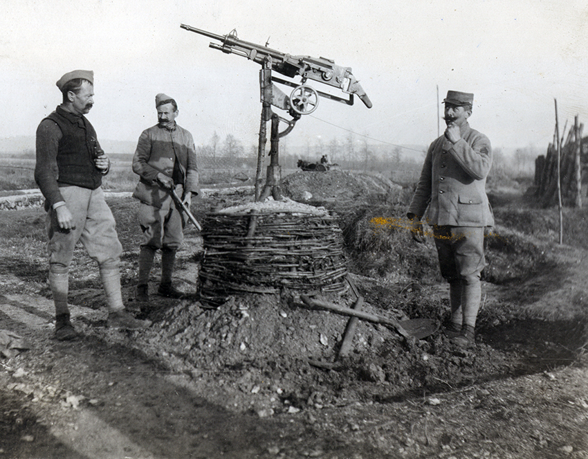 Item is a photograph of three unknown soldiers with the anti-aircraft machine gun that was positioned near the hospital in Vasseny, France.
