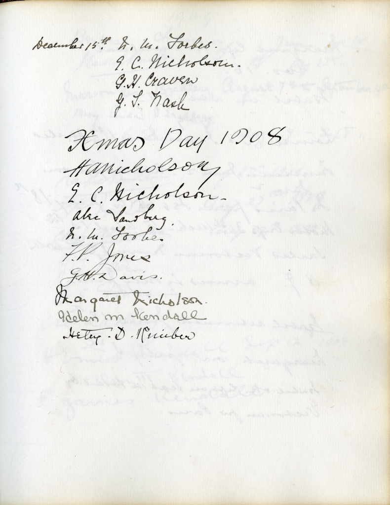 Item is the guestbook that was used at the Petersfield Estate, and later by Katharine at events on her home on Whitney Avenue, Sydney. In fact, Petersfield is most famous and historically interesting because of the guests who stayed there. Besides frequent local visitors like Hetty Kimber and her brother Fred, Shirley Davidson, the Burchells, the Sutherlands, the Grosvenors and visiting family members, the estate boasted visitors of international renown.