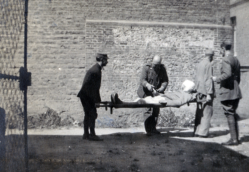 Item is a photograph of a man being carried on a stretcher after a convoy had arrived at the Hôpital de l'Alliance.