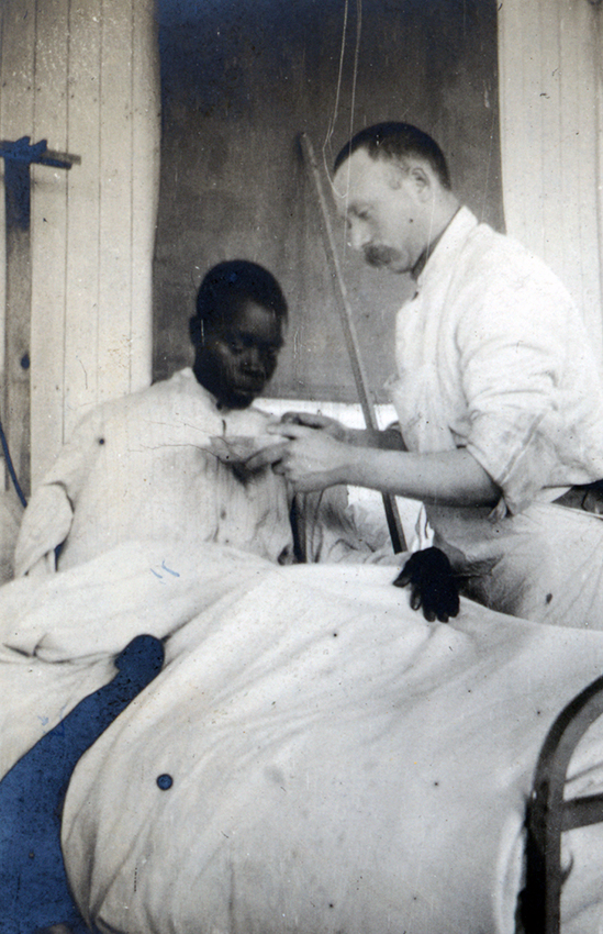 Item is a photograph of Chumpdavoine, a member of hospital staff, feeding patient Marco in the H.O.E. 18, S.P. 118 in Vasseny, France.