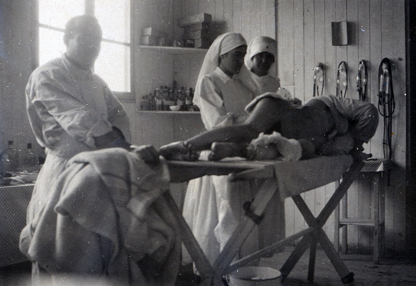 Item is a photograph of Katharine McLennan and Helen Homans applying a dressing in the Salle de Pensement at the H.O.E. 18, S.P. 118 in Vasseny, France.