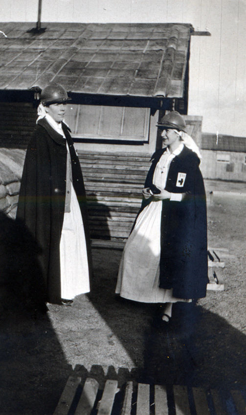 Item is a photograph of nurses Mlle. Gourdon and Mlle. Weyer at the H.O.E. 18, S.P. 118 in Vasseny, France.