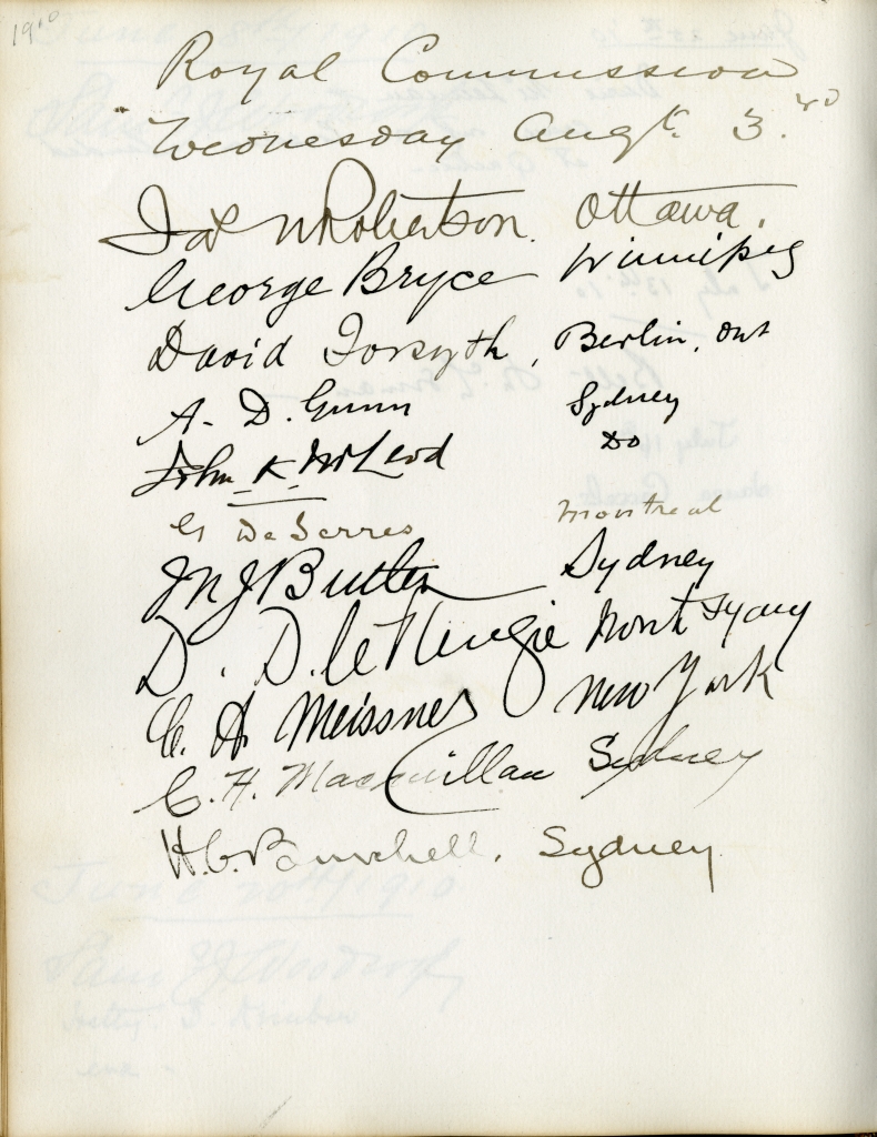Other notable pages in the guestbook include Isabel's wedding (page 106), the tragic death of Louise McLennan in 1912 (page 109), Margaret's wedding to future Lieutenant-Governor, Dr. Henry Ernest Kendall (page 113), the deaths of both son Hugh and J.S.'s brother Bart in battle during World War I (page 126). J.S. McLennan's death is noted in an elegant tribute written by Katharine on page 162.