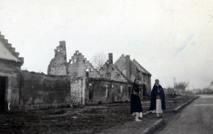 Item is a photograph of Katharine McLennan and Edith Parkman standing amongst the ruins of the town of Sermoise, France. The area surrounding their station at H.O.E. 18, S.P. 118 in Vasseny, France had been decimated by bombing, unlike the areas that Katharine and her colleagues visited near Yvetot and Pont-Audemer.